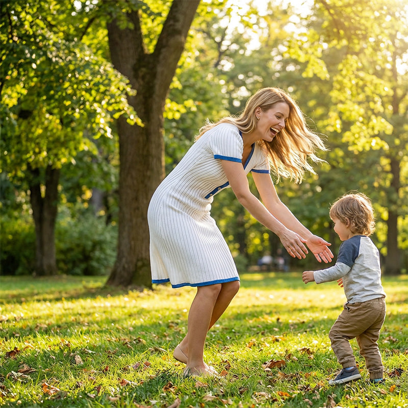 Robe en maille rayée à encolure en V et longueur genou pour femmes