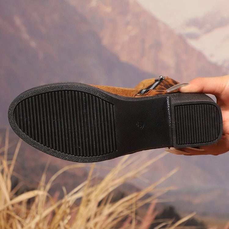PATCHWORK LÉOPARD AUDACIEUX - Le patchwork léopard aux riches tons bruns attire tous les regards. Le daim synthétique épouse la forme de votre pied comme une seconde peau, tandis que le placement astucieux des motifs garantit que chaque paire de bottes est unique : offrez-vous un véritable chef-d'œuvre.